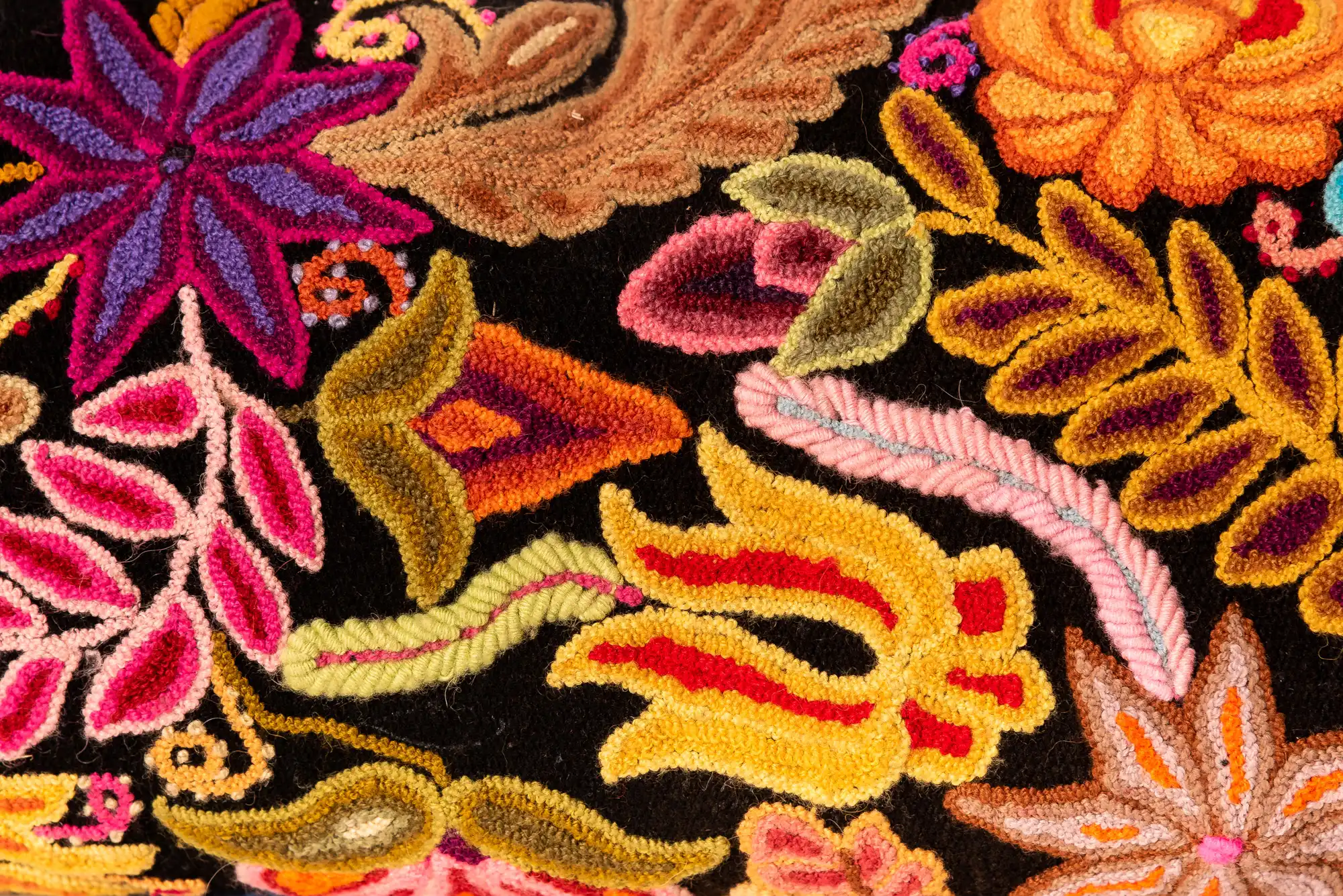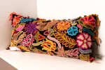 Cojin bordado hecho a mano ,muy representativo de la región de Ayacucho,por su variedad en colores muy alegres ,en estos tejidos se demuestra la riqueza de flora y fauna Ayacuchana.Camino elaborado en en dos etapas ,primer tejido en telar llamada “Pampas”,y la segunda etapa es bordado a mano ,con detalle en los bordes de bordados a crochet.