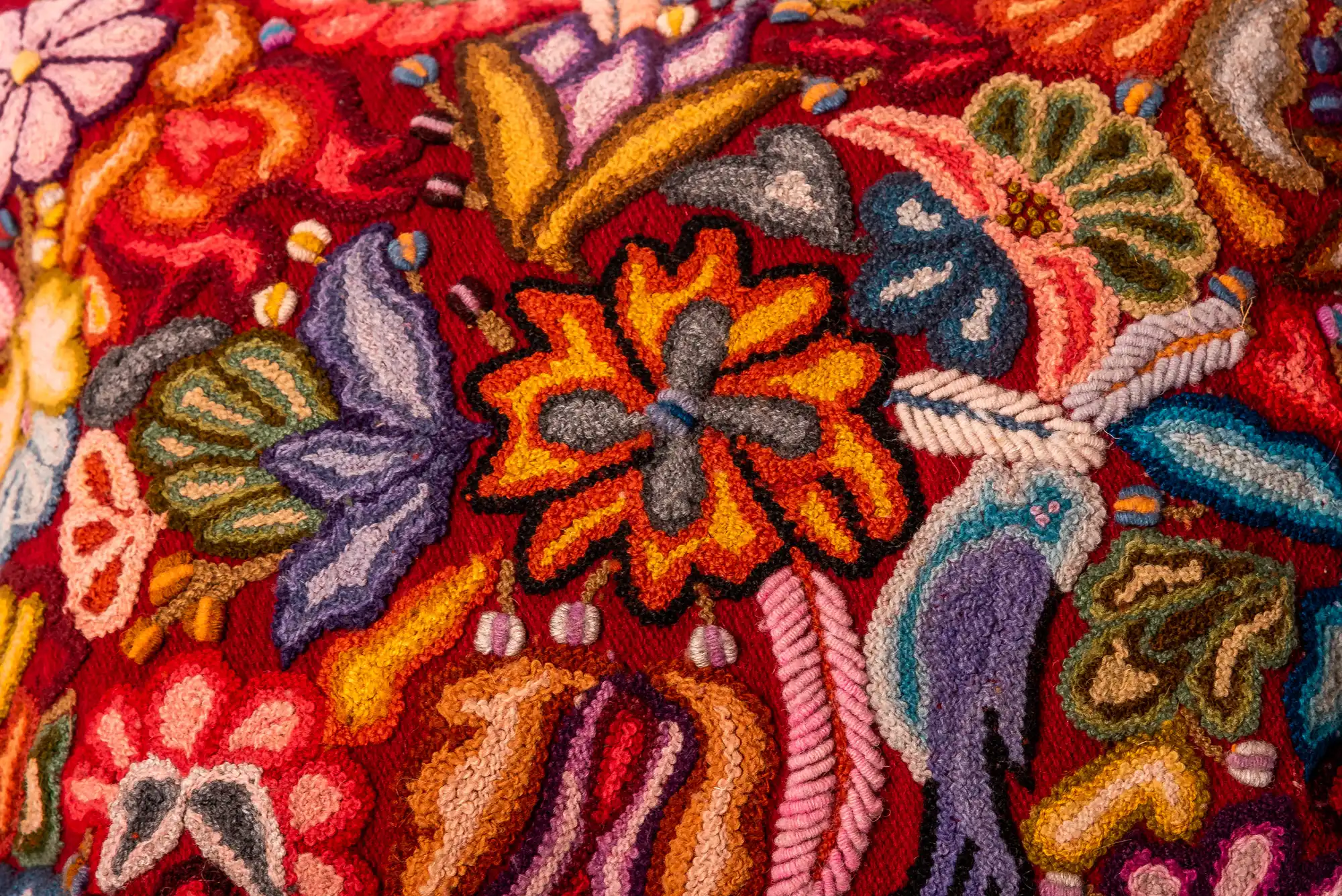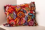 Cojin bordado hecho a mano ,muy representativo de la región de Ayacucho,por su variedad en colores muy alegres ,en estos tejidos se demuestra la riqueza de flora y fauna Ayacuchana.Camino elaborado en  en dos etapas ,primer tejido en telar  llamada “Pampas”,y la segunda etapa es bordado a mano ,con detalle en los bordes de bordados a crochet.