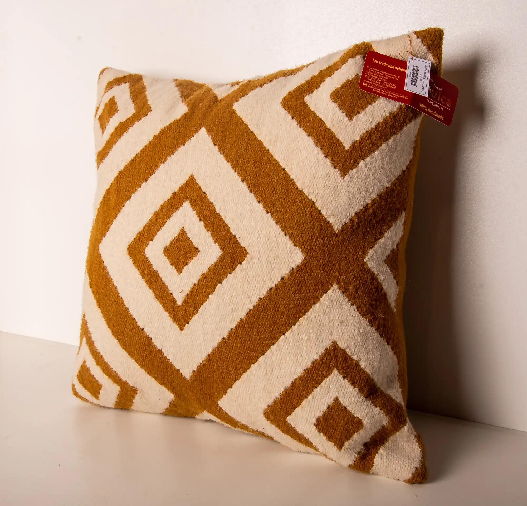 Cojin Moderno hecho con pelo de llama y tejido en telar ,representado por una iconografía inca,donde se puede apreciar diseño en forma de rombo o diseño infinito “Pachamama”. Con colores blanco y tonalidad amarilla,todo a base de teñidos naturales .Muy decorativo propios para casa de campo u oficina.