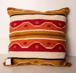 Cojin Moderno hecho con pelo de llama y tejido en telar ,representado por una iconografía colonial-inca ,donde se puede apreciar diseño tocapu,representaciones geométricas o diseño de montañas. Con colores sobrios o tierra .Muy decorativo propios para salas de espera.
