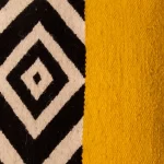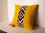 Cojin Moderno hecho con pelo de llama y tejido en telar ,representado por una iconografía inca,donde se puede apreciar diseño en forma de rombo o diseño infinito “Pachamama”. Con colores amarillo y negro.Todo a base de teñidos naturales .Muy decorativo propios para casa de campo.