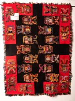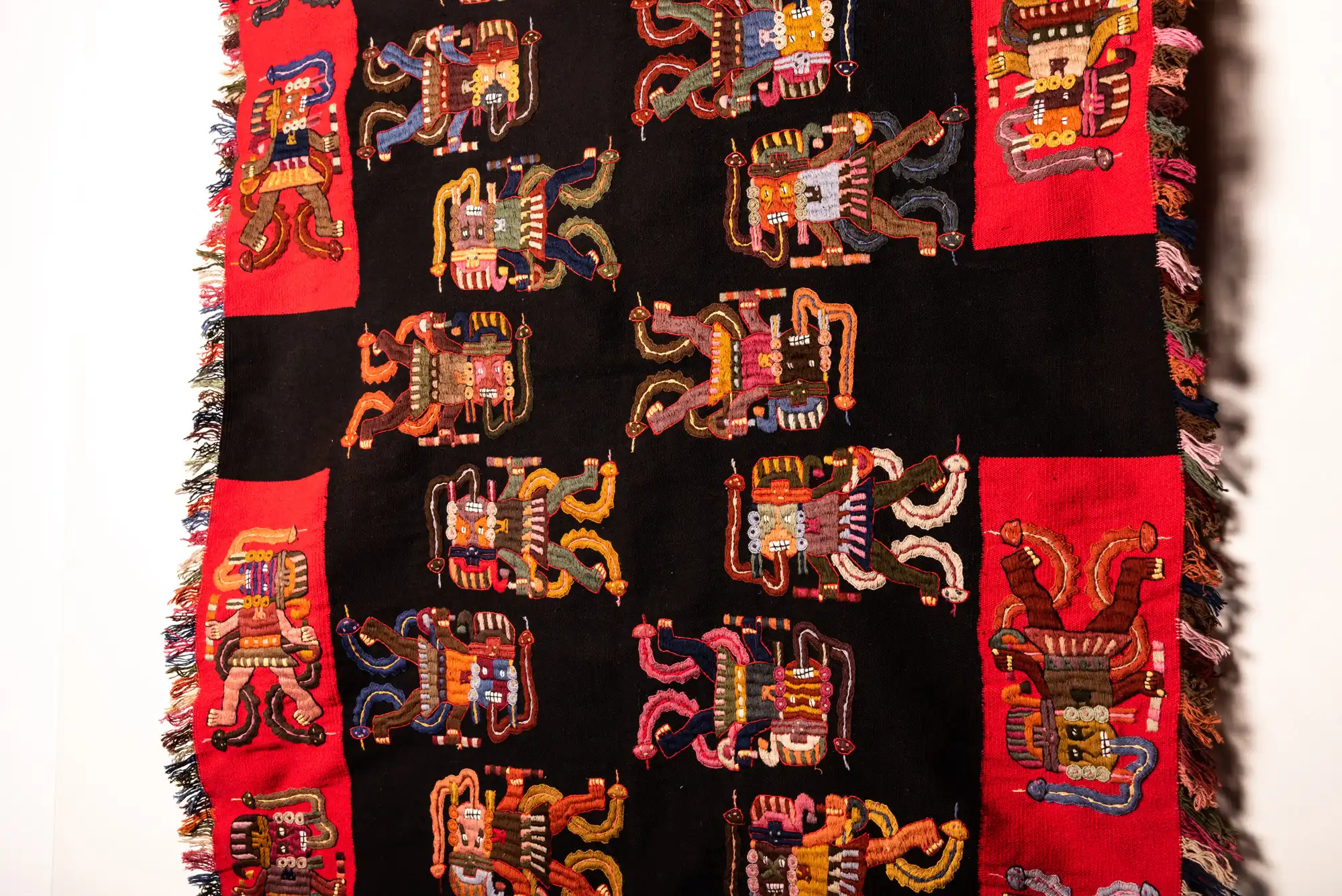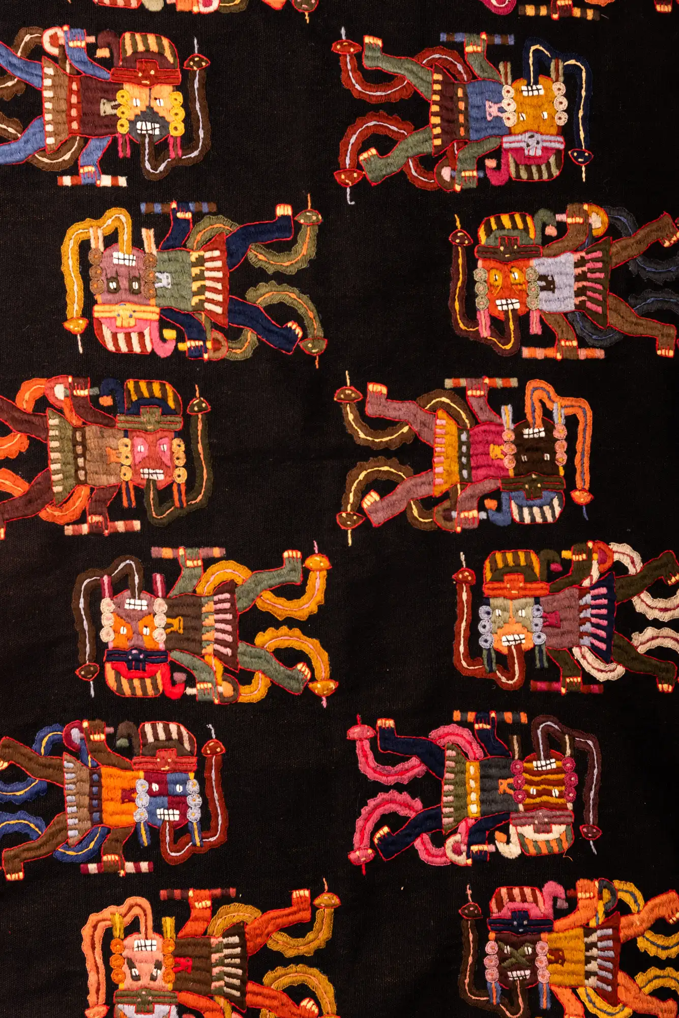 Manto Paracas representa a una divinidad antropomorfa es un gobernante sucesivo que lidera un grupo de guerreros ,figura de la deidad sobrenatural que está asociada a la caza de cabezas-trofeo y a la élite religiosa.Los colores representativos en el tapiz son azul,naranja y marrón, estos tonos oscuros invocan la sensación de poder de las personas cubiertas de estos mantos.